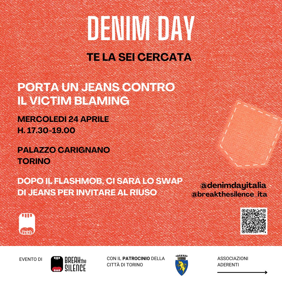 Vuoi far sentire anche la tua voce al Denim Day? Break The Silence Italia esorta la cittadinanza ad aderire al flashmob portando un paio di jeans da stendere in piazza insieme a tutte le altre persone presenti, esibendo questo simbolico oggetto in un luogo pubblico e invitando chi assiste a riflettere sull’accaduto e sul fenomeno sociale e culturale della vittimizzazione secondaria. Dopo il flashmob, inizierà lo swap: ci sarà la possibilità di scambiarsi i jeans invitando al riuso.