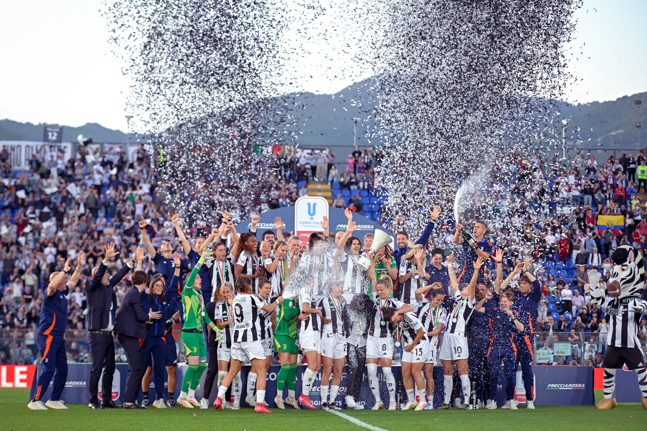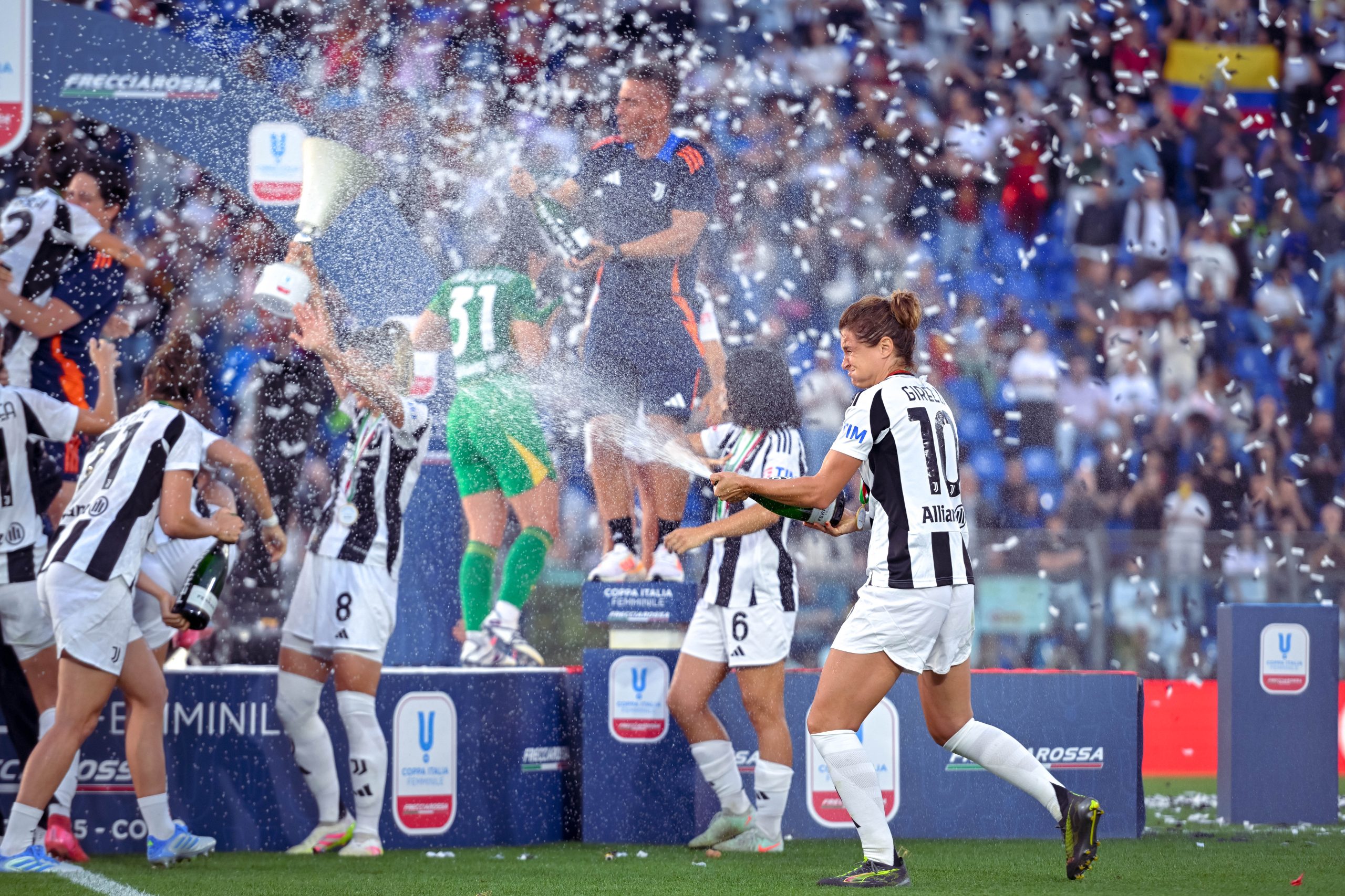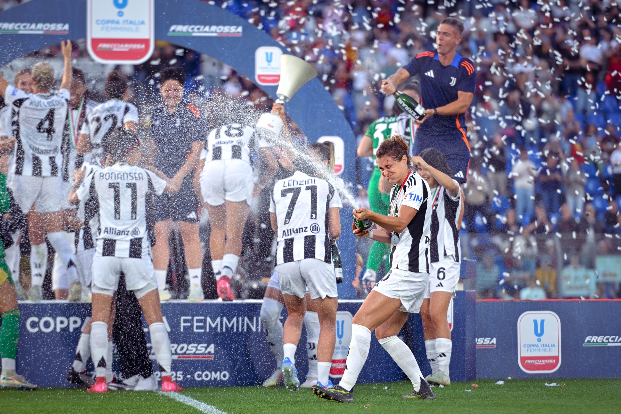 Già nel primo tempo la sfida si chiude virtualmente: grazie alle reti di Cristiana Girelli (doppietta), Sofia Cantore e Lindsey Thomas. Il secondo tempo scorre senza scossoni, con la Roma che tenta invano di reagire ma trova davanti a sé una Juventus compatta e concentrata. Al triplice fischio, può partire la festa: abbracci, cori e la classica corsa sotto la curva bianconera per celebrare un successo che chiude la stagione nel migliore dei modi.
