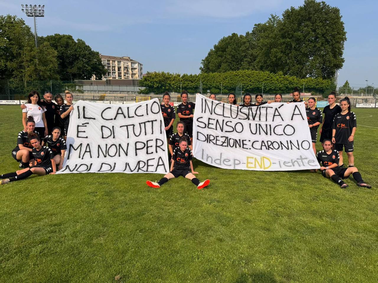 “Il calcio è di tutti, ma non per noi di Ivrea. Inclusività a senso unico, direzione: Caronno. Indep-END-iente.”